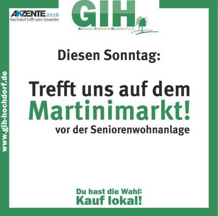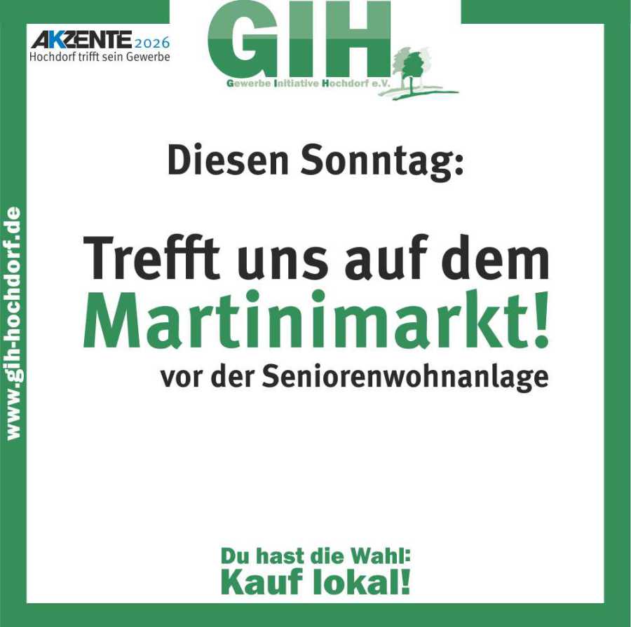 Trefft uns diesen Sonntag zum ersten Mal auf dem Martinimarkt! Falls ihr Fragen zur GIH habt – oder erste Info zur Akzente 2026. Für Kinder haben wir Luftballons dabei – holt euch euren ab! Ihr findet unseren Stand oben vor der Seniorenwohnanlage, gegenüber dem Karussell. Wir freuen uns auf spannende Gespräche mit euch!